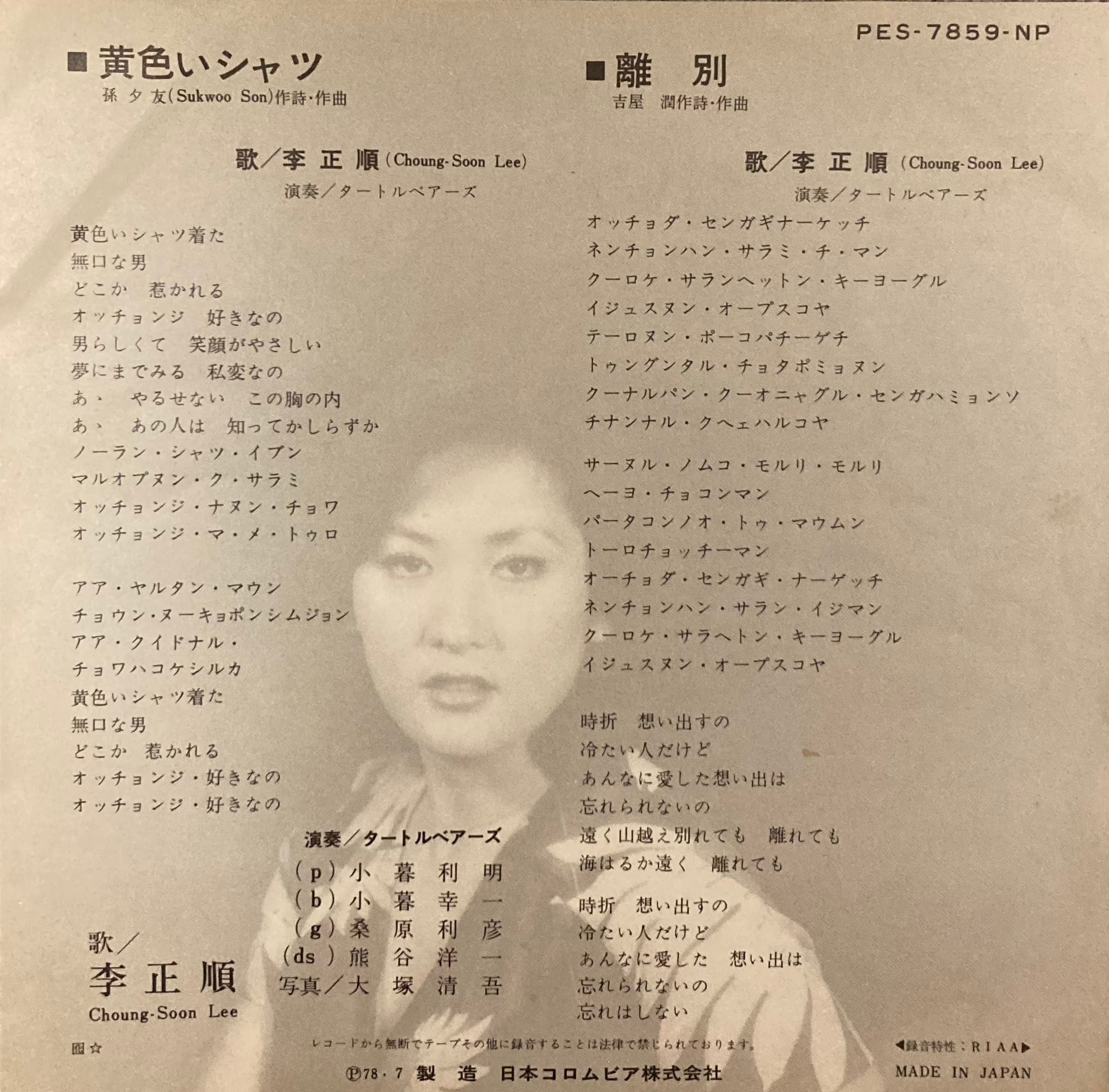 全く謎の李正順なる韓国人シンガーがタートルベアーズなるグループをバックに歌うレアシングル!